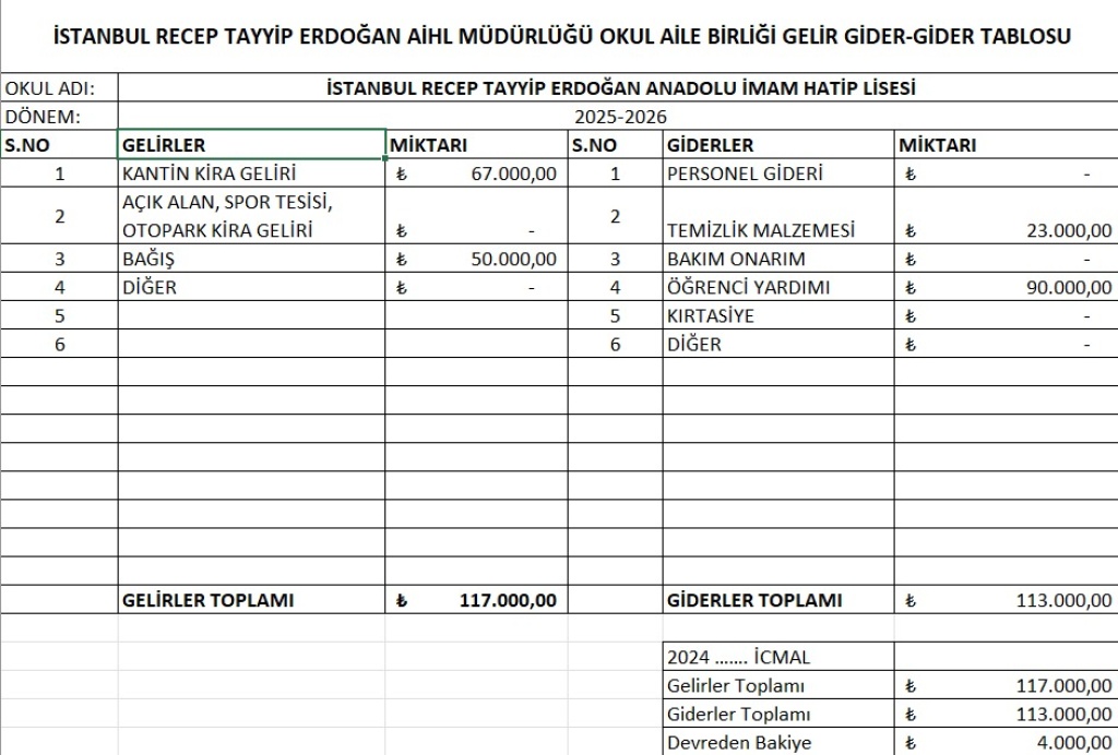 OKUL AİLE BİRLİĞİ GELİR-GİDER TABLOSU